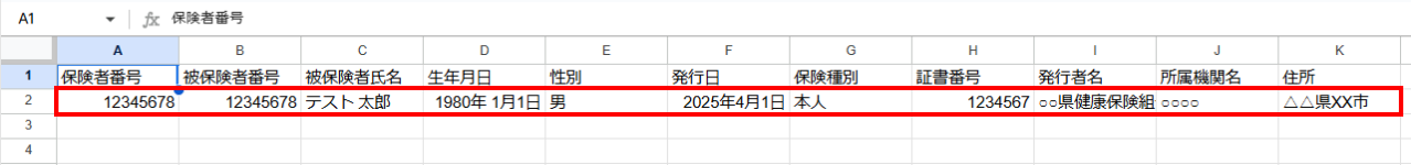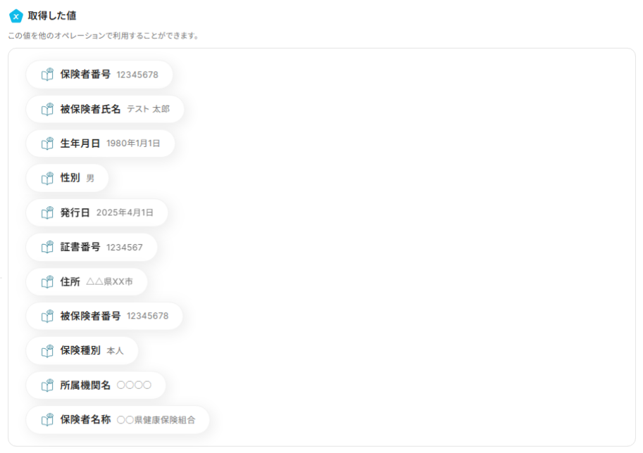 テストが成功すると、下記のように保険証画像から抽出した文字情報が反映されているはずです。