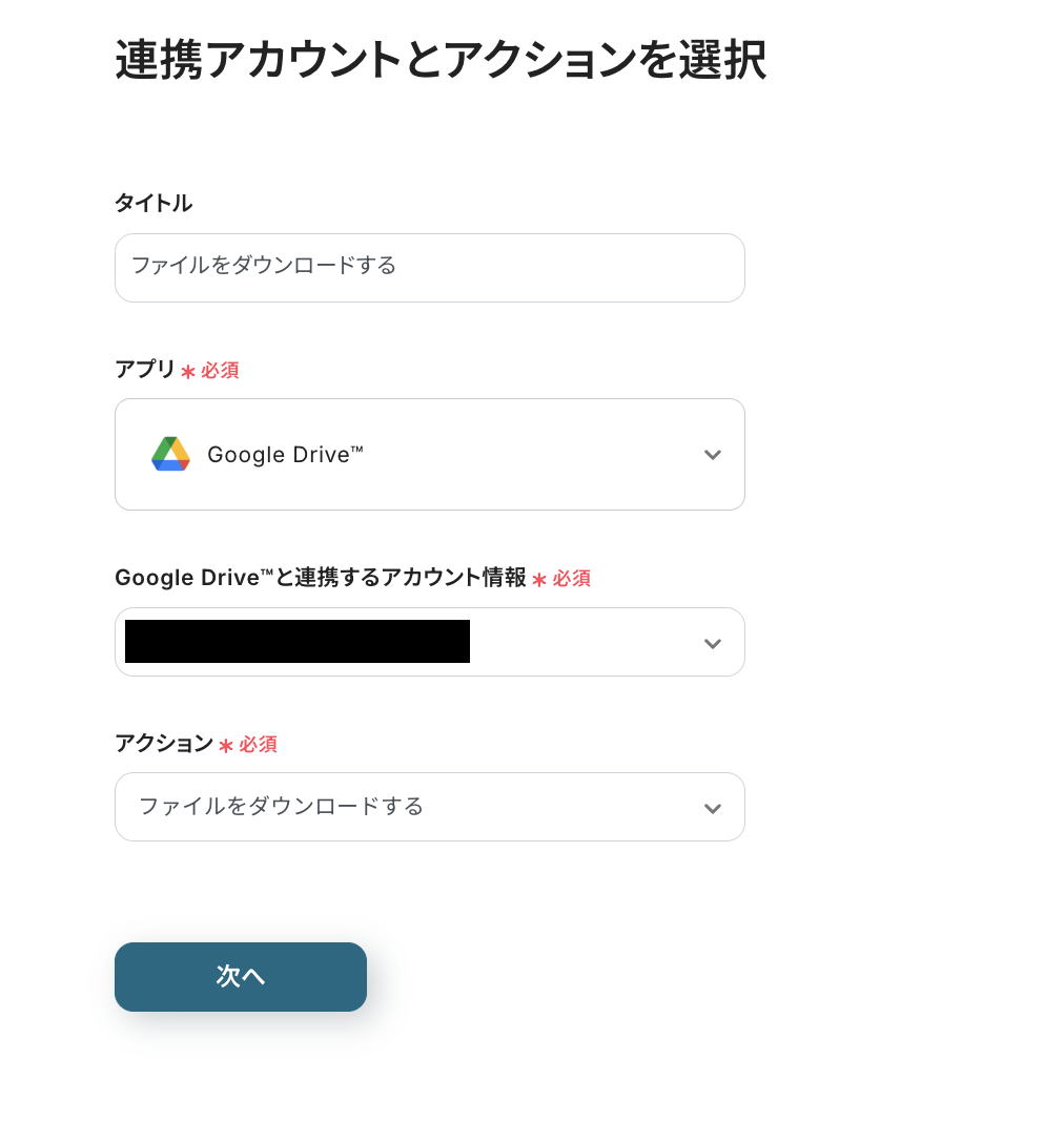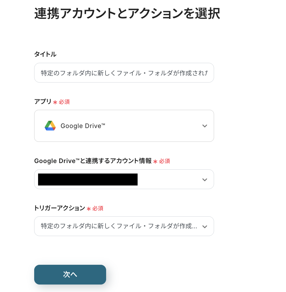 これまでと同様に、タイトルと連携するアカウント情報を任意で設定し、アクションはテンプレート通りのまま「次へ」をクリックして進んでください。