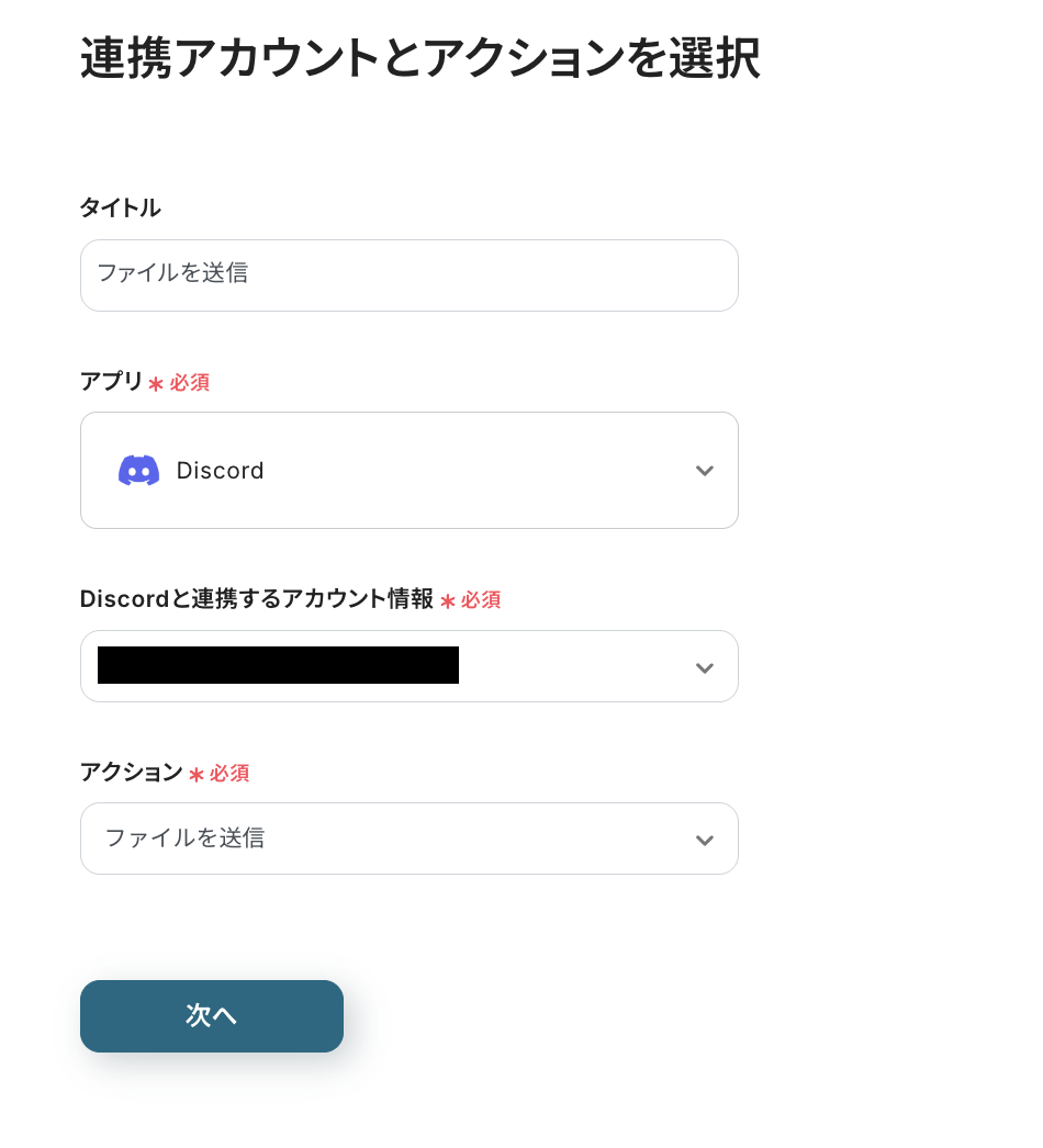タイトルと連携するアカウント情報を任意で設定し、アクションはテンプレート通りのまま「次へ」をクリックして進んでください。