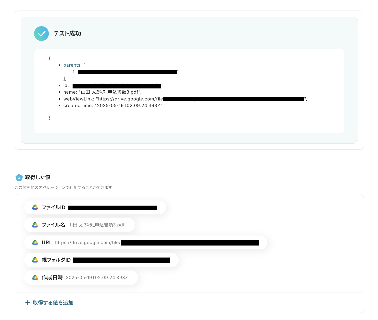 書類のアップロードが完了したら、Yoomの画面に戻って「テスト」をクリックしましょう。テストが成功すると、「取得した値」に先ほどアップロードしたテスト書類の情報が、アウトプットとして抽出されます。