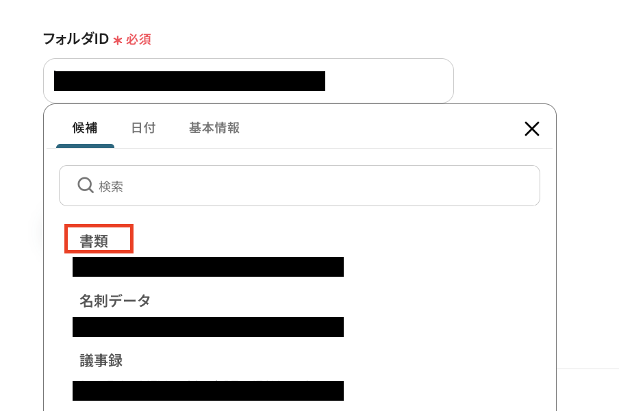 「フォルダID」は、入力欄をクリックして表示される候補から選択します。