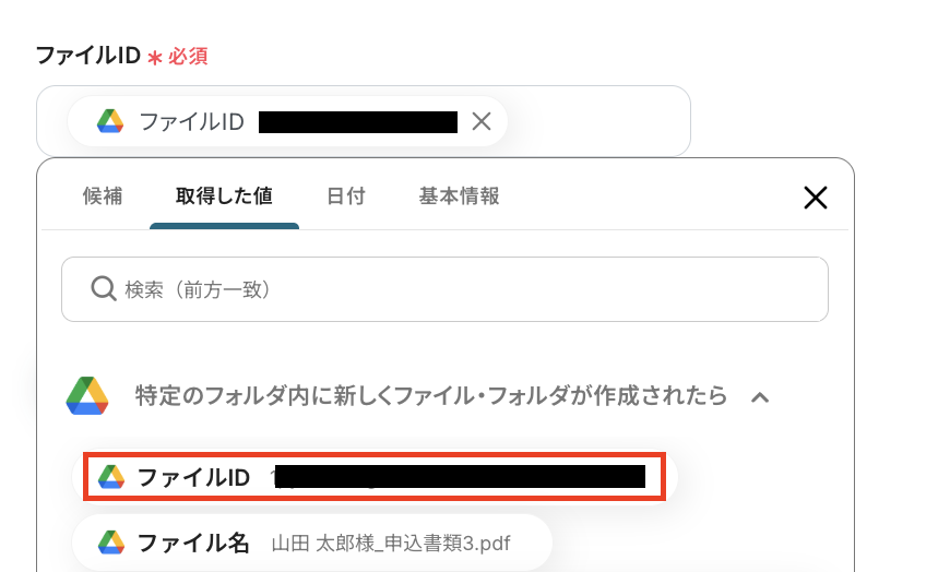 入力欄を押すとアウトプットが表示されるので、「取得した値」の「特定のフォルダ内に新しくファイル・フォルダが作成されたら」内にある、「ファイルID」を選択してください。