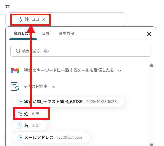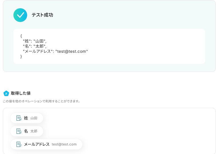 トリガーやオペレーション設定時に、「テスト」を実行して取得した値のことを指します。