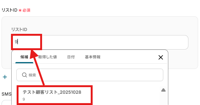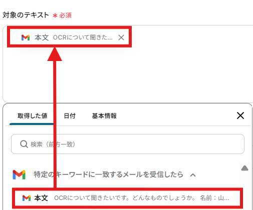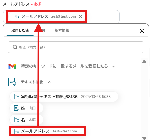 ・件名、本文:それぞれ入力します。②で取得した値を埋め込むことも可能です。