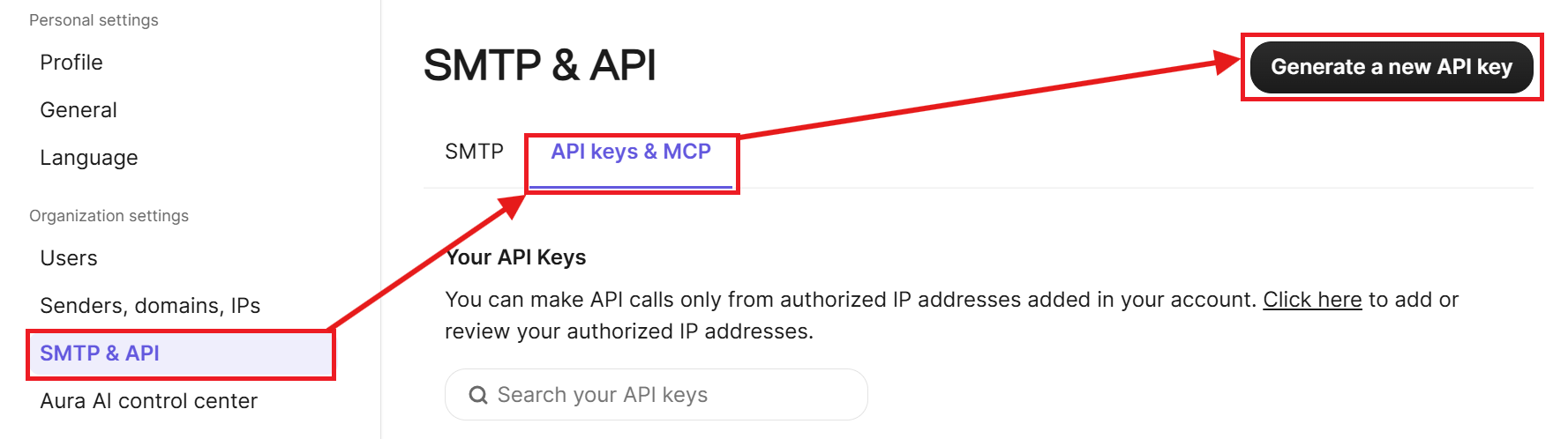SMTP&APIをクリックし、API Keys&MCPタブから「Generate a new API」をクリックします。
