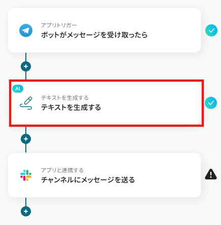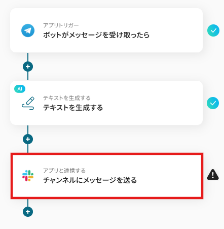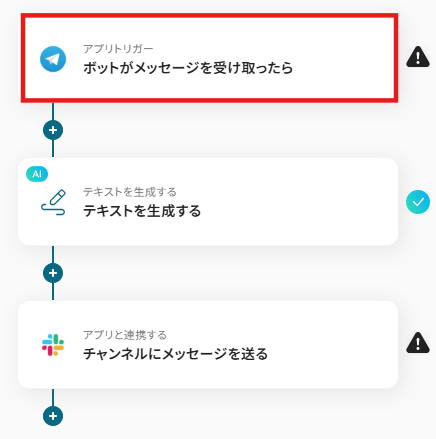それではここから代表的な例として、Telegramで問い合わせを受信した際に、AIがその内容に基づいて回答案を作成し、Slackに通知するフローを解説していきます!