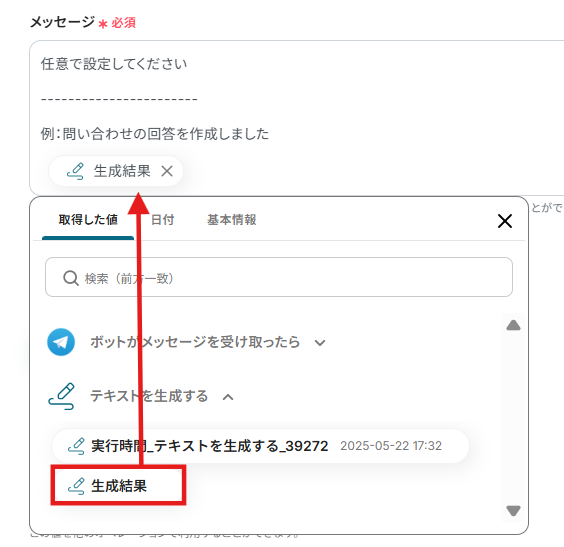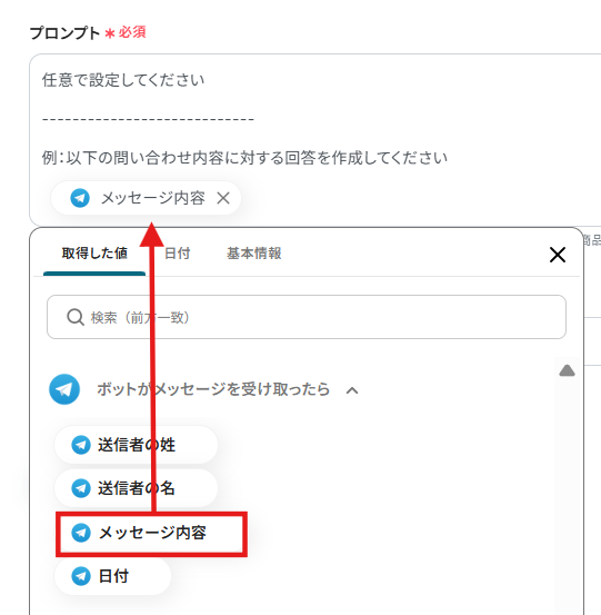 3.プロンプトには要約したい文章を設定したいので、トリガー設定で取得したアウトプットから選択します。