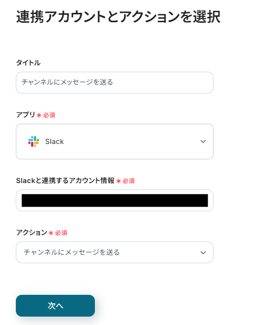 タイトルと連携するアカウント情報を任意で設定し、アクションはテンプレート通りに「チャンネルにメッセージを送る」のまま「次へ」をクリックして進んでください。