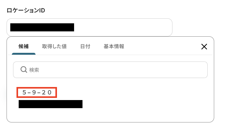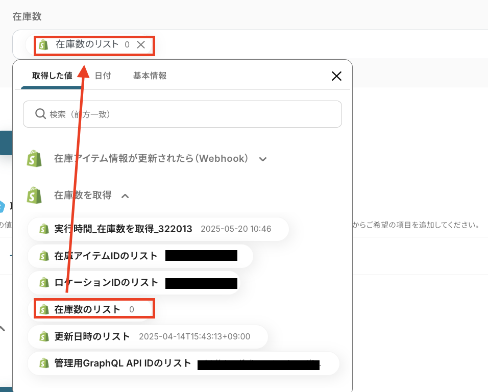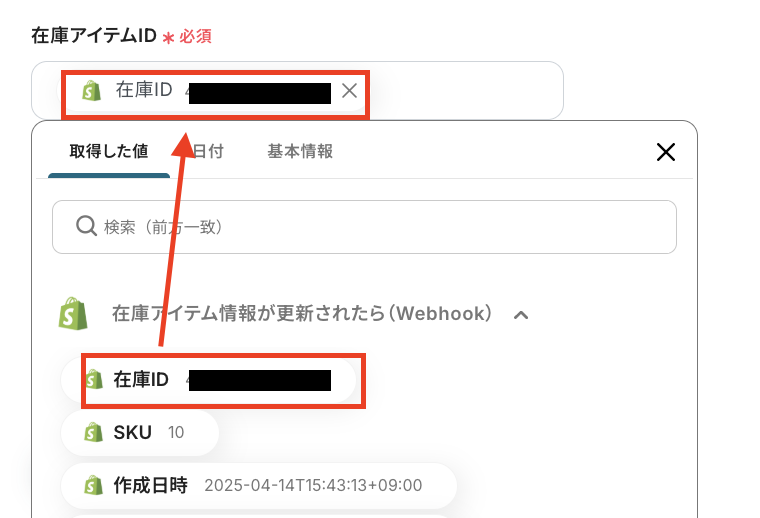 「取得した値」の「在庫アイテム情報が更新されたら(Webhook)」内にある、「在庫ID」を選択しましょう!