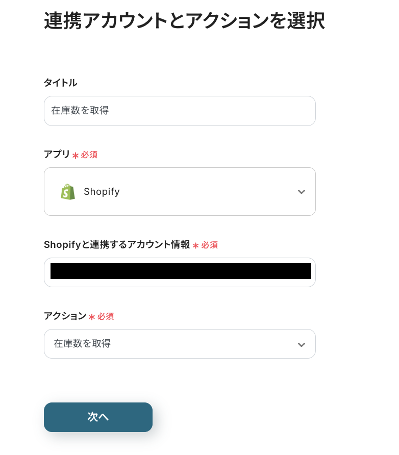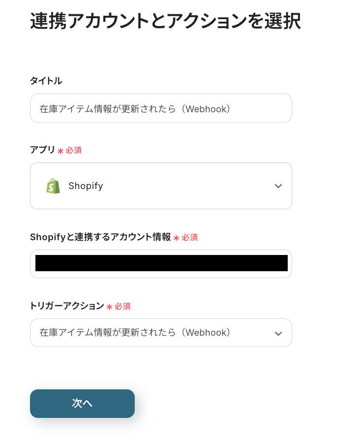 トリガーアクションは「在庫アイテム情報が更新されたら(Webhook)」のままにして、「次へ」をクリックしてください。