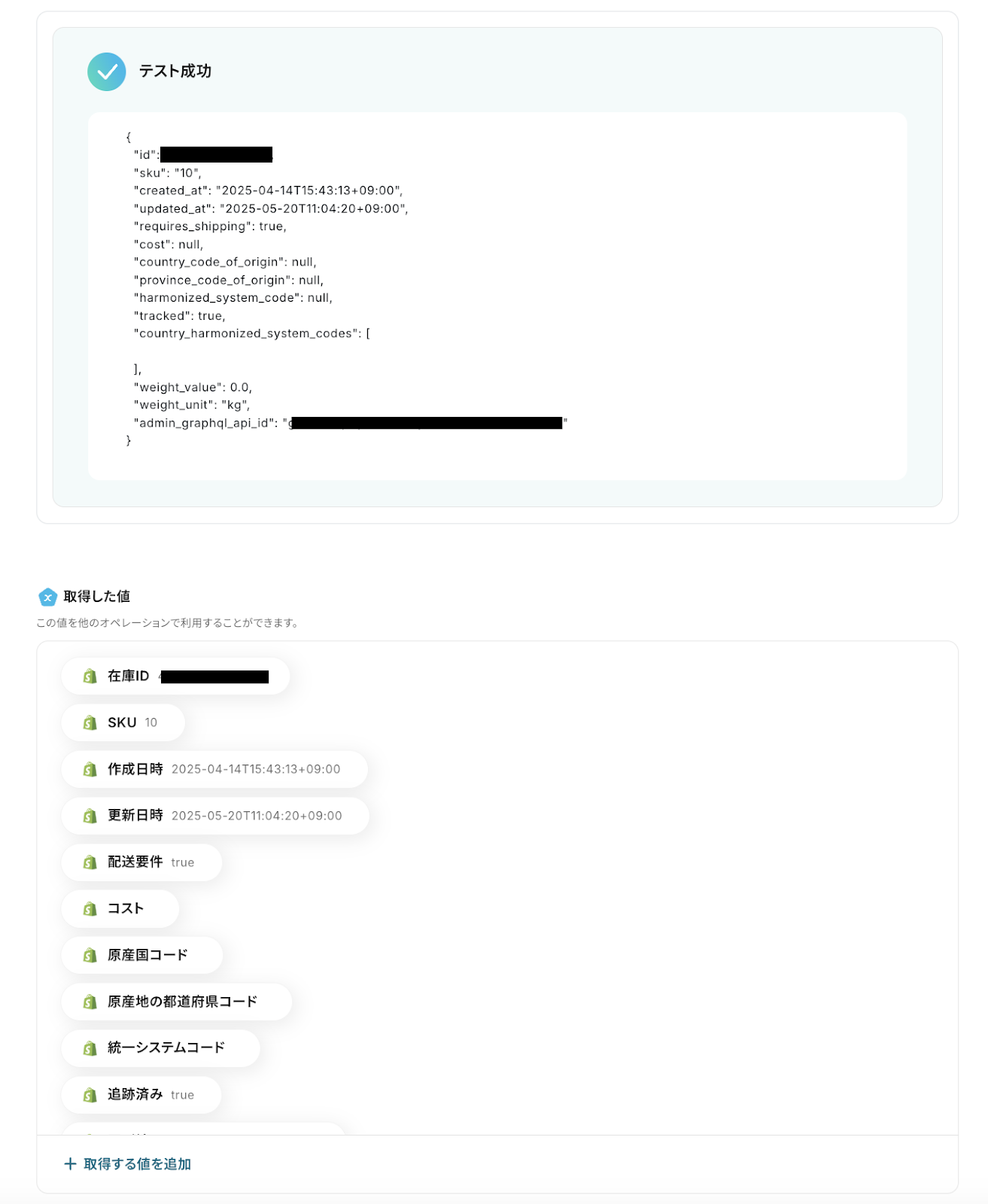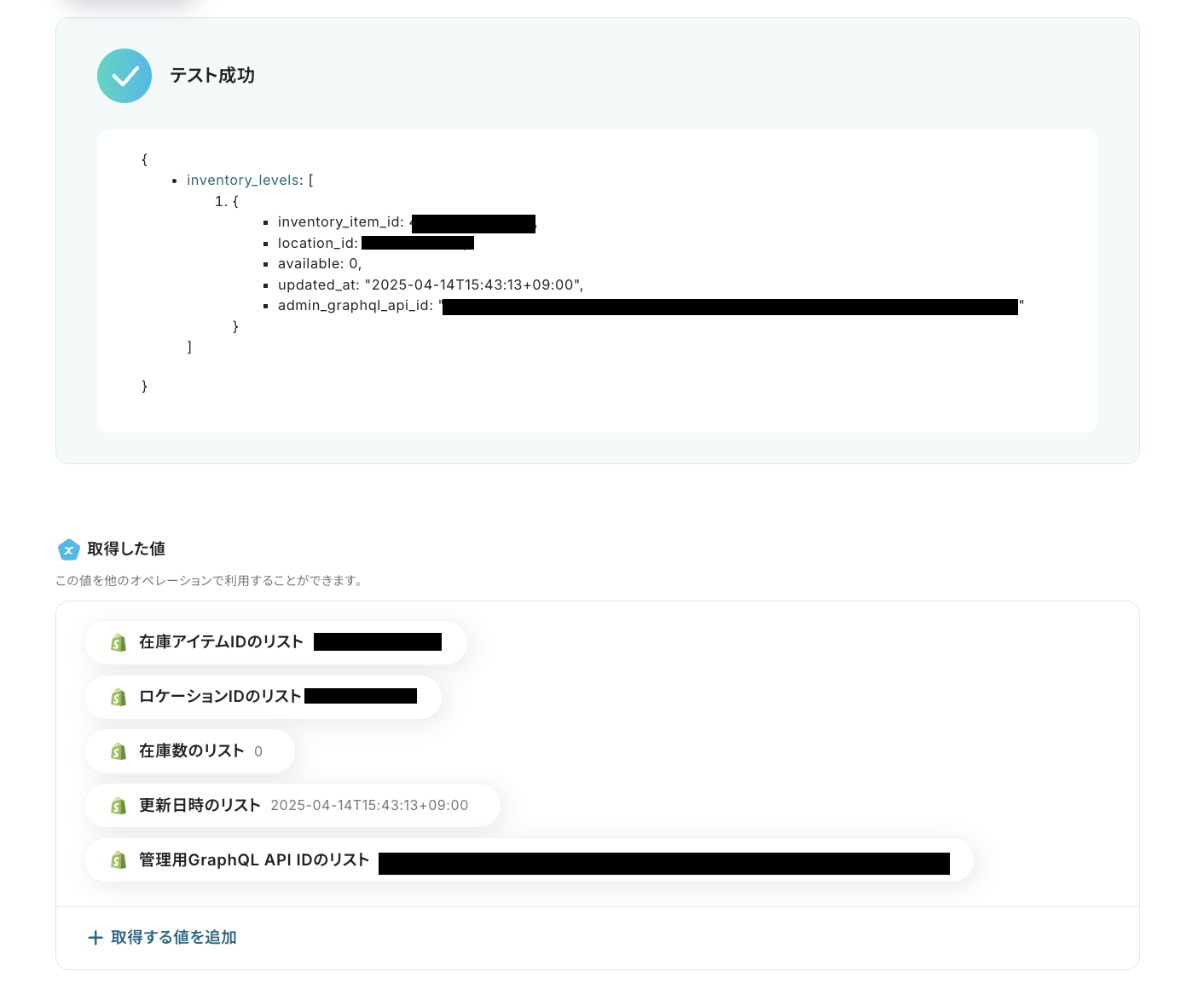 テストが成功すると、先ほど在庫数を更新した商品の情報が、「取得した値」にアウトプットとして抽出されます。