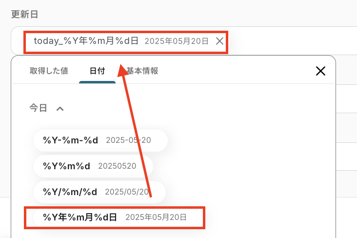「更新日」には「日付」のアウトプットを使って、在庫数を更新した日付が反映されるようにしています。