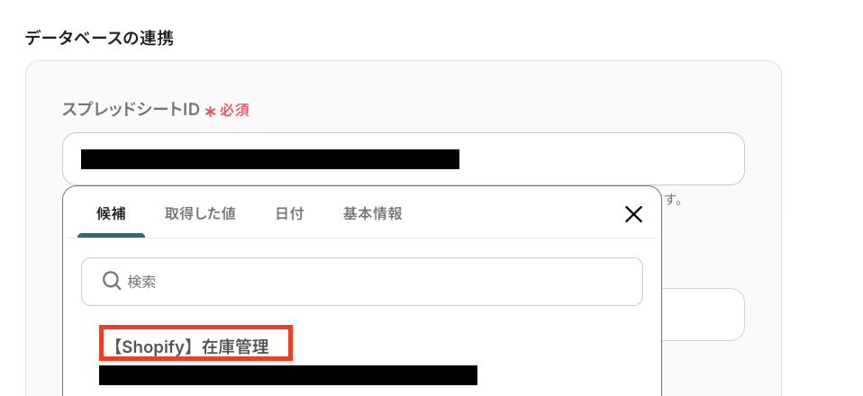 「スプレッドシートID」に、Shopifyの在庫管理をしているGoogle スプレッドシートを設定します。