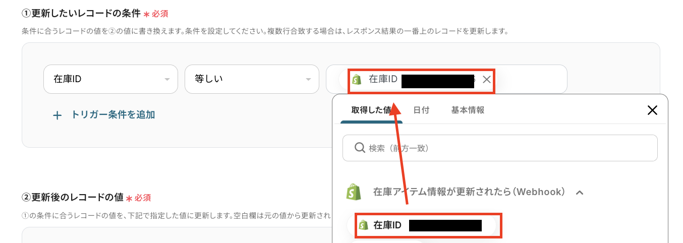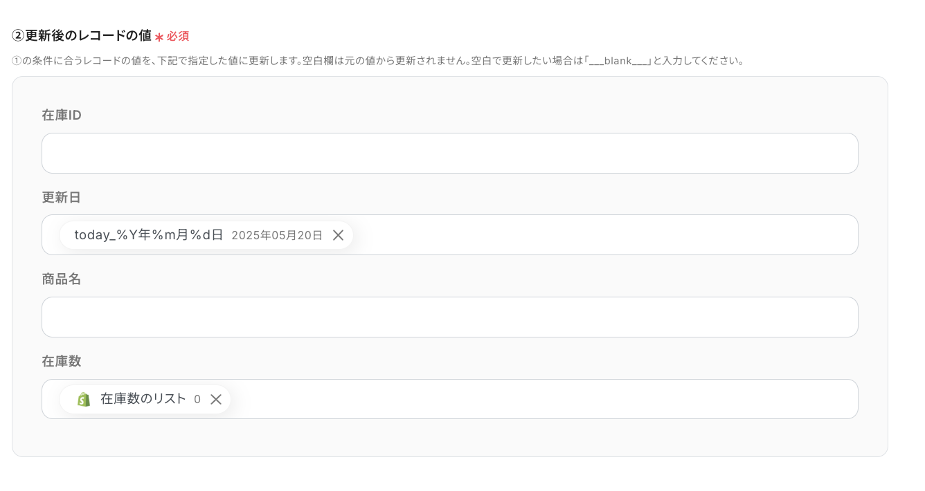 「更新したいレコードの条件」に、Shopifyのデータを反映させるレコードの条件を指定します。