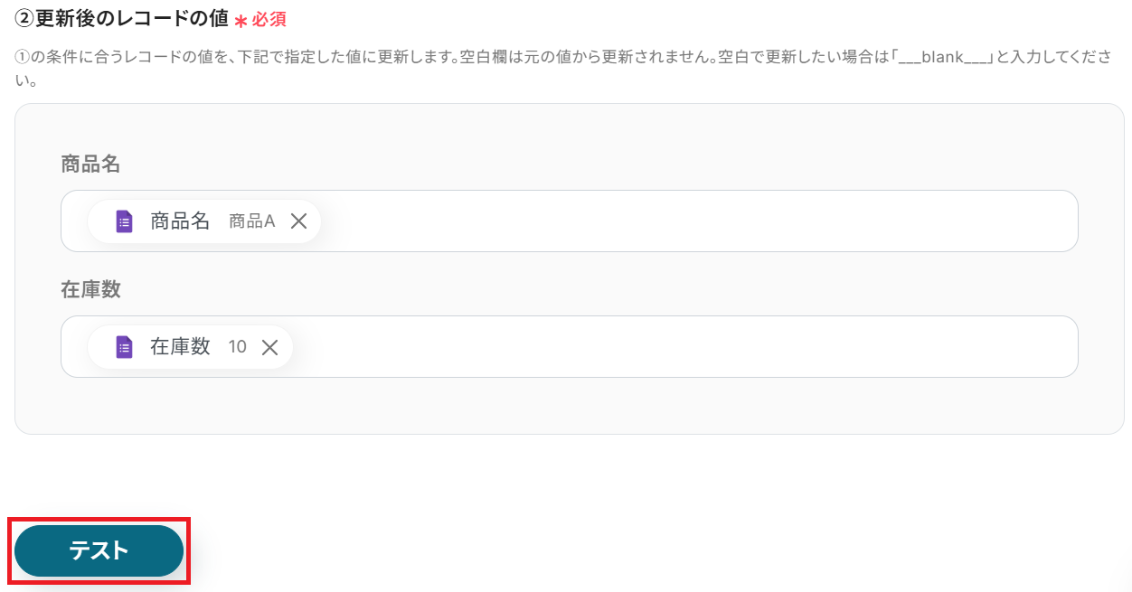 まず「①更新したいレコードの条件」の「商品名」「等しい」の右の欄に、ステップ3で取得したアウトプットの「商品名」を選択してください。