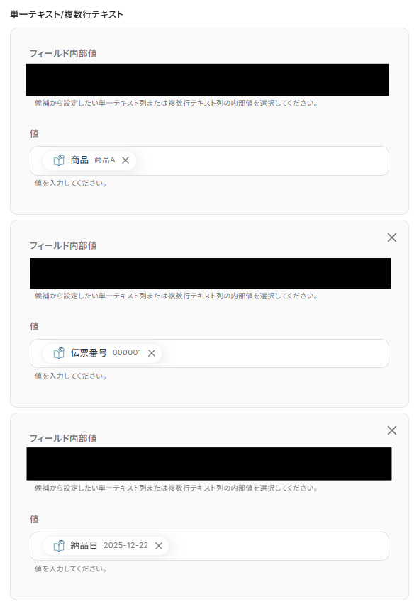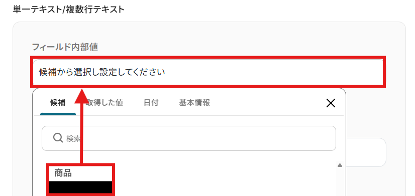 残りの項目を任意で設定していきましょう。 「単一テキスト/複数行テキスト」の設定は以下のように行います。 「フィールド内部値」を候補から選択します。
