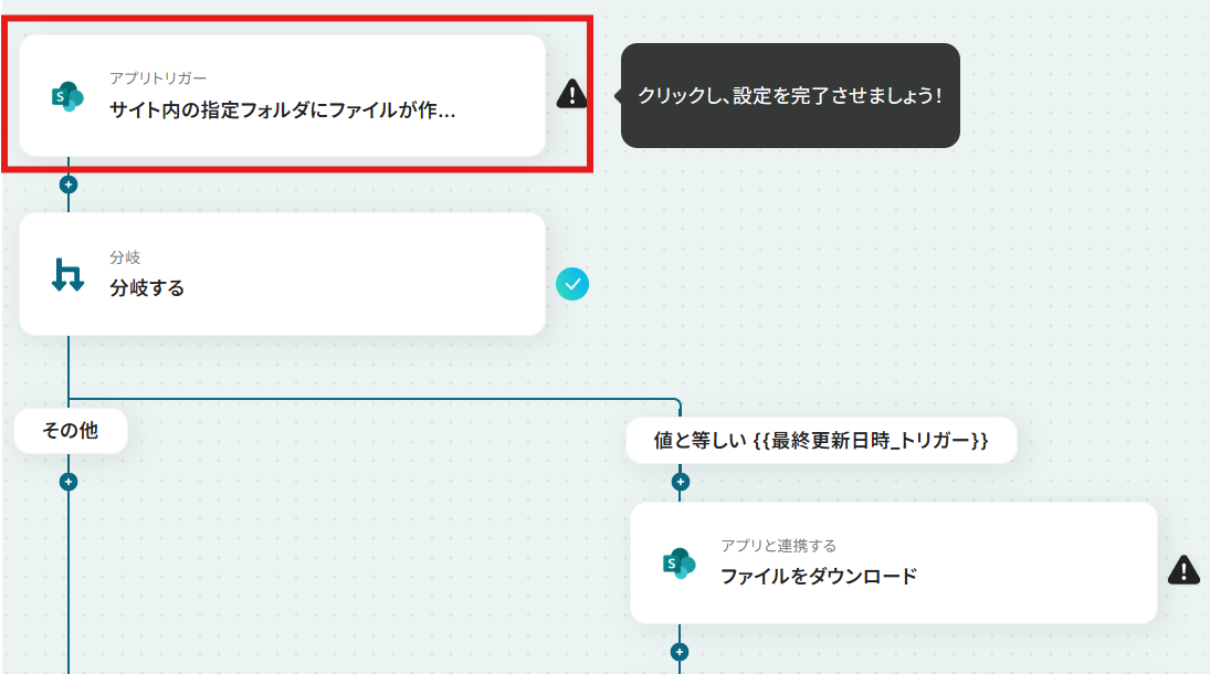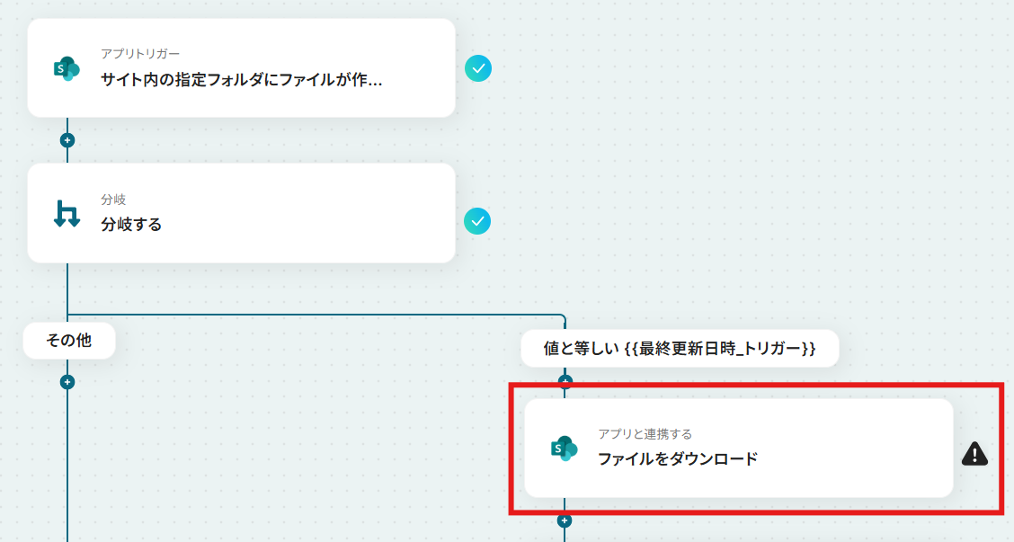 アプリの仕様上、ファイルの作成日時と最終更新日時が同一にならない場合があり、正しく分岐しない可能性がありますのでご了承ください。 「サイト内の指定フォルダにファイルが作成または更新されたら」を選択します。