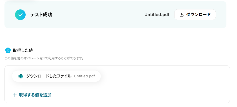 設定できたら「テスト」を行いましょう。 テストに成功すると、対象のファイルがダウンロードされます。 この時、ダウンロードされたファイルの名前は「Untitled」で固定されるため、正しいファイルであるかを確認する場合は「ダウンロード」をお試しください。 「完了」を選択しましょう。