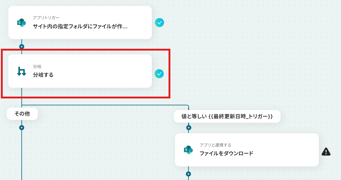 分岐機能では、Trelloのカード情報(リスト名、ラベル名など)をもとに、フォルダを作成する条件を任意に設定できます Microsoft SharePointでフォルダを作成する際に、フォルダ名にTrelloのカード名を設定するなど、固定値や前のステップで取得した情報を活用して柔軟な設定が可能です ■注意事項