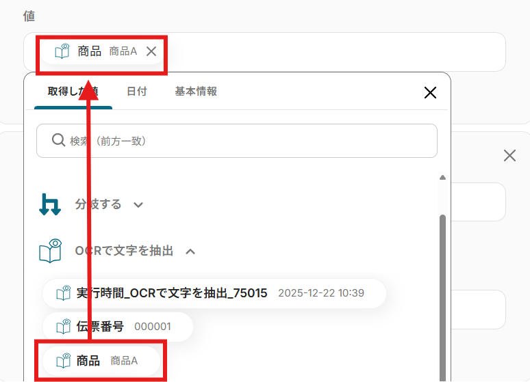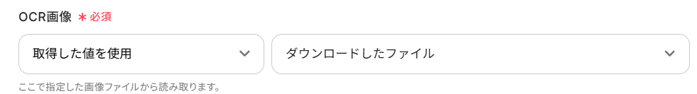 「OCR画像」が「取得した値を使用」「ダウンロードしたファイル」に設定されているか確認しましょう。