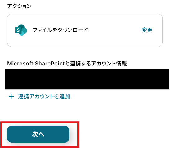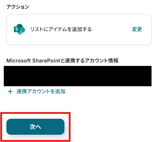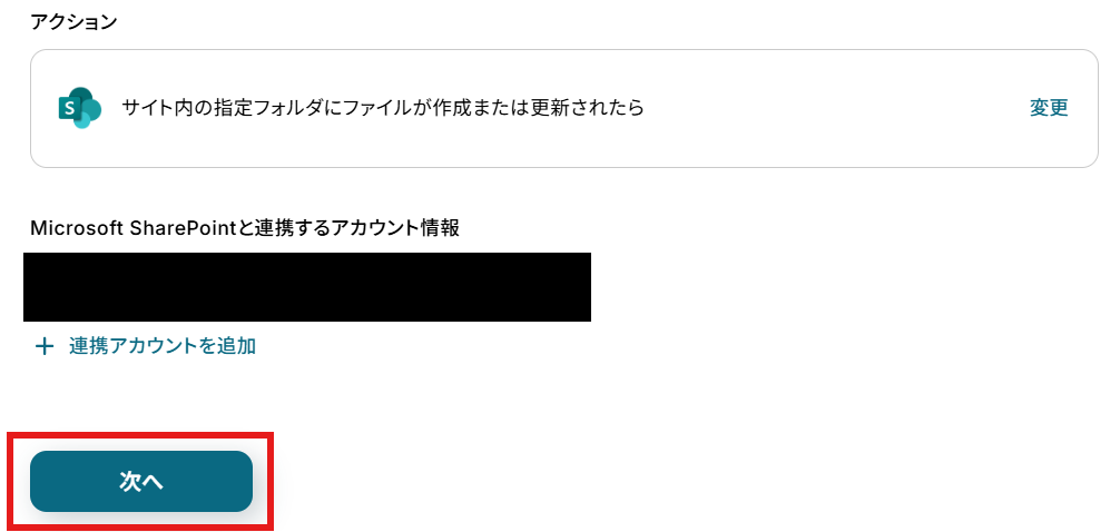 「アクション」はテンプレート通りのままでOKです! 「Microsoft SharePointと連携するアカウント情報」を確認し、「次へ」をクリックして進んでください。