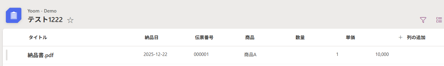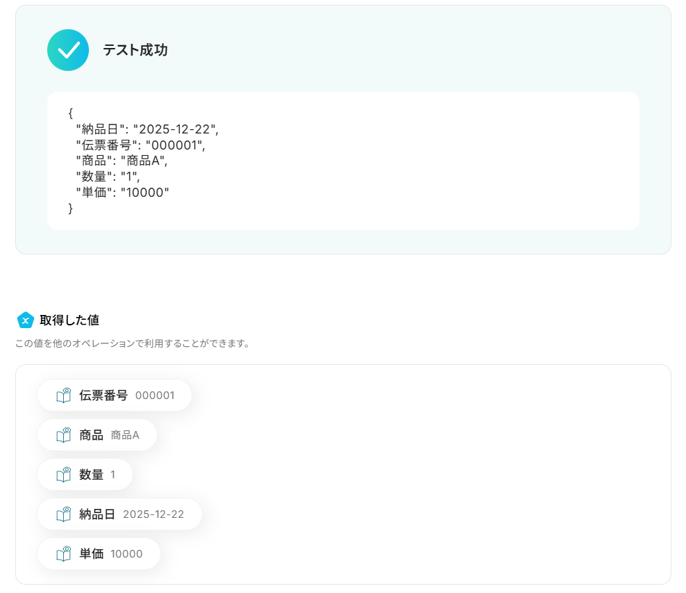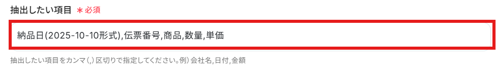 「抽出したい項目」を手動で入力します。 今回は例として「納品日(2025-10-10形式),伝票番号,商品,数量,単価」を抽出するように設定しています。 小計や消費税などの項目も追加で設定できるので、必要に応じて項目をカスタマイズしてくださいね。