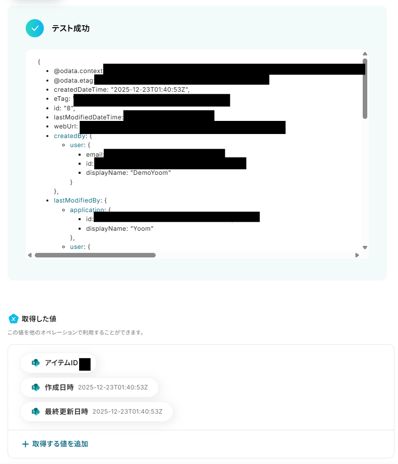 設定できたら「テスト」を行いましょう。 テストに成功すると「取得した値」に反映されます。 「完了」を選択しましょう。