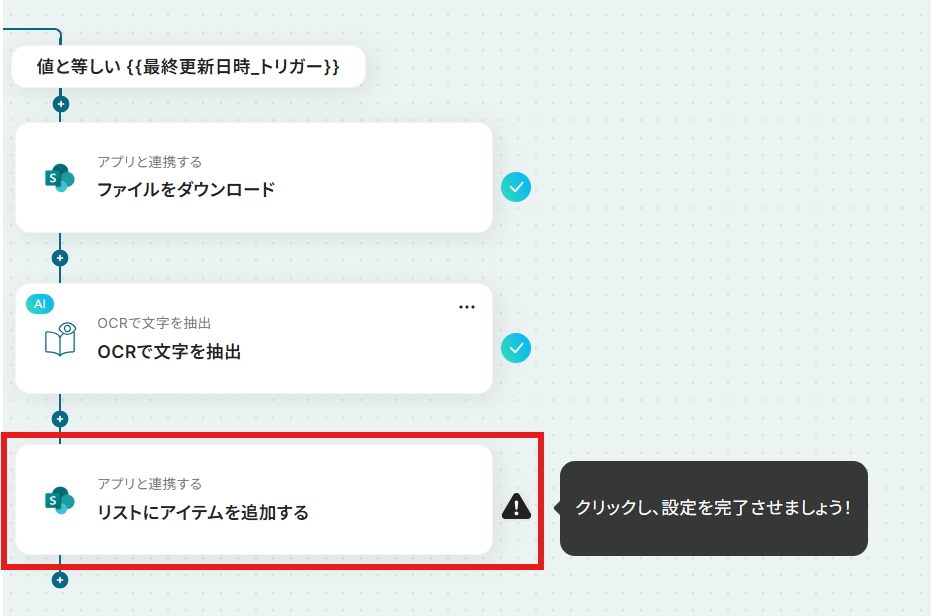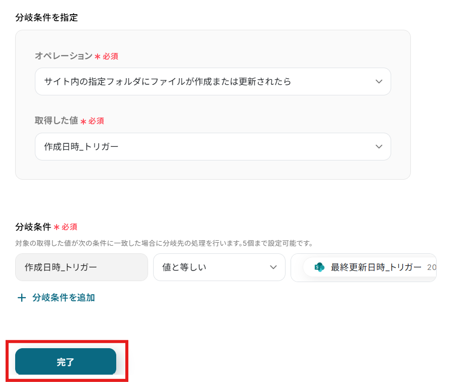 今回のフローではファイルが作成された際にOCRを使用してリストに詳細を追加したいので、「作成日時_トリガー」が{{最終更新日時_トリガー}}と等しいか否かで分岐するようにあらかじめ設定してあります。 確認して「完了」を選択しましょう。