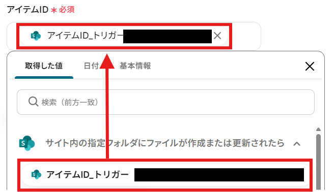 「アイテムID」を「取得した値」から設定しましょう。 取得した値は変数となります。固定値ではないため、トリガーが実行されるたびに取得した情報を反映できます。