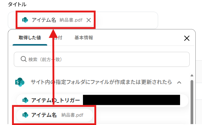 Microsoft SharePointでリストにアイテムを追加する際に、どの項目にどの情報を追加するかを自由に設定できます。例えば、OCR機能で読み取った「商品名」や「数量」といった値を、Microsoft SharePointリストの対応する列に変数として埋め込むことが可能です また、登録日や担当者名など、特定の項目に固定のテキストや日付を入力するようなカスタムも行えます ■注意事項
