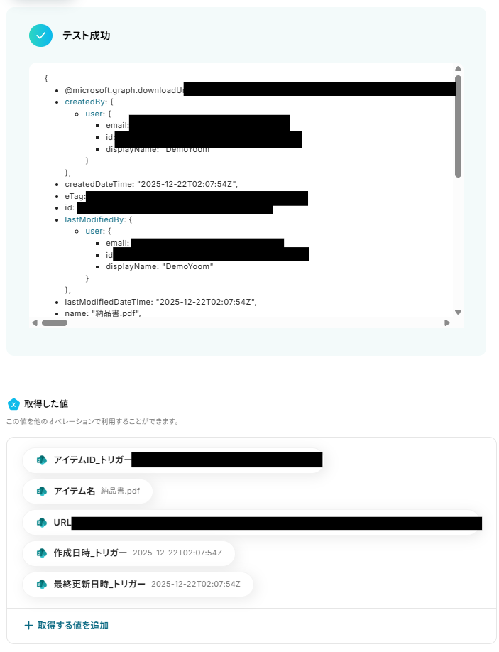 ※取得した値 とは? トリガーやオペレーション設定時に、「テスト」を実行して取得した値のことを指します。 後続のオペレーション設定時の値として利用でき、フローボットを起動する度に変動した値となります。