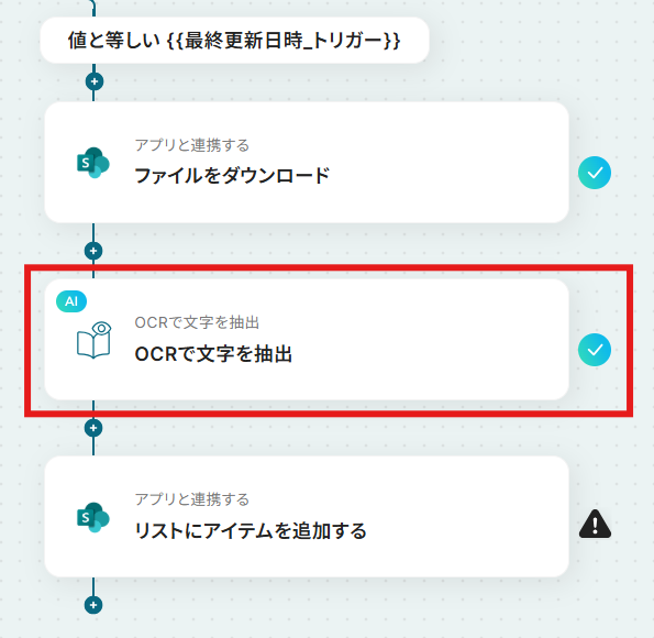 はじめに、Microsoft SharePointをYoomと連携します 次に、トリガーでMicrosoft SharePointを選択し、「サイト内の指定フォルダにファイルが作成または更新されたら」を設定します 次に、オペレーションで分岐機能を設定し、新規ファイルかどうかに応じて後続の処理を分けます 続いて、オペレーションでMicrosoft SharePointの「ファイルをダウンロード」アクションを設定します 次に、OCR機能の「任意の画像やPDFを読み取る」を設定し、ダウンロードしたファイルからテキストを抽出します 最後に、Microsoft SharePointの「リストにアイテムを追加する」アクションを設定し、抽出した情報をリストに追加します ※「トリガー」:フロー起動のきっかけとなるアクション、「オペレーション」:トリガー起動後、フロー内で処理を行うアクション■このワークフローのカスタムポイント