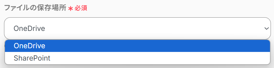 ファイルの保存場所:プルダウンで「OneDrive」か「SharePoint」か選択できます。今回は「OneDrive」を選択しています。