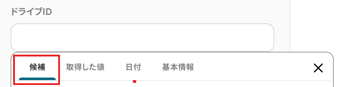 ドライブID、アイテムID、格納先のフォルダID:入力欄をクリックすると以下のように候補が表示されるので、その中から選択しましょう。