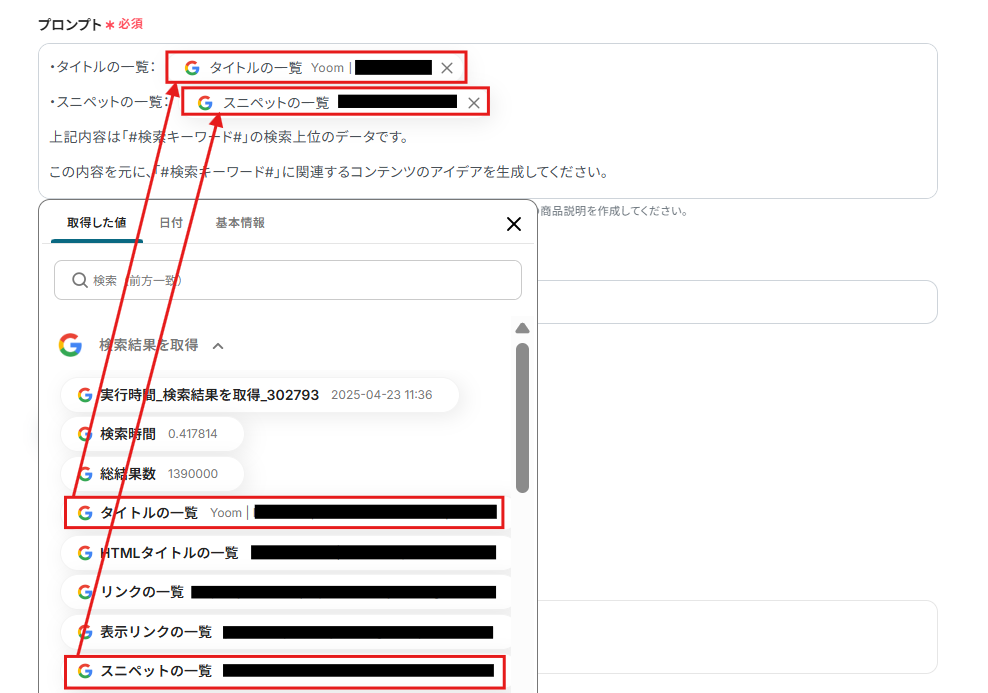タイトルの一覧とスニペットの一覧は、取得した値から選択してください。