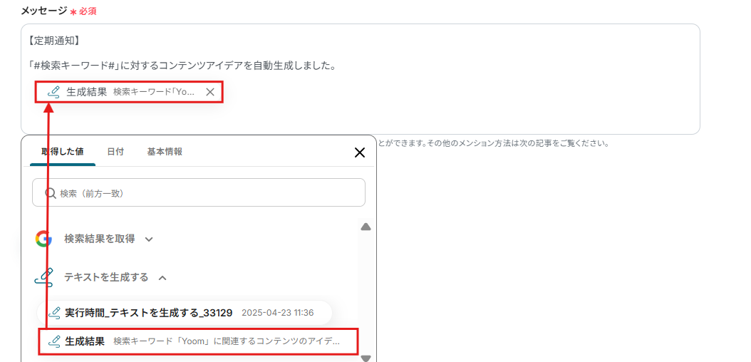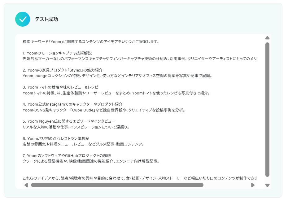 今回は「この内容を元に検索ワードに関するコンテンツのアイディアを生成してください」と設定しました。