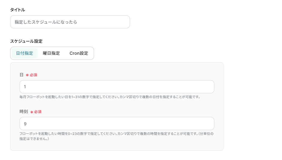スケジュール設定で、実行時間の指定をします。今回は「日付指定」で1日の9時にトリガーが起動する設定にしました。