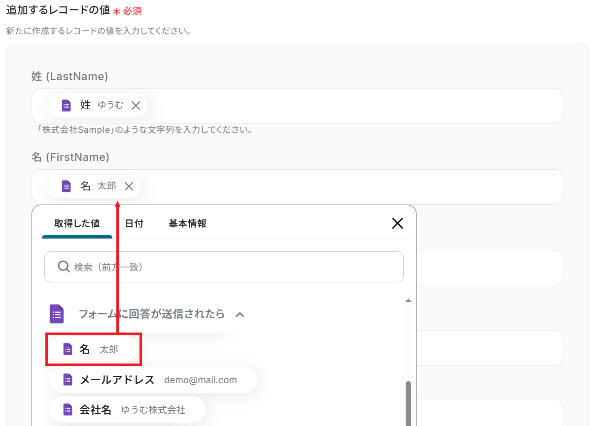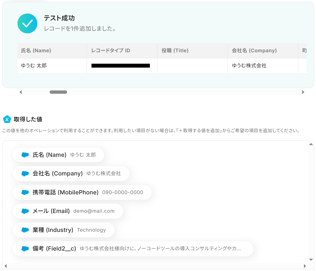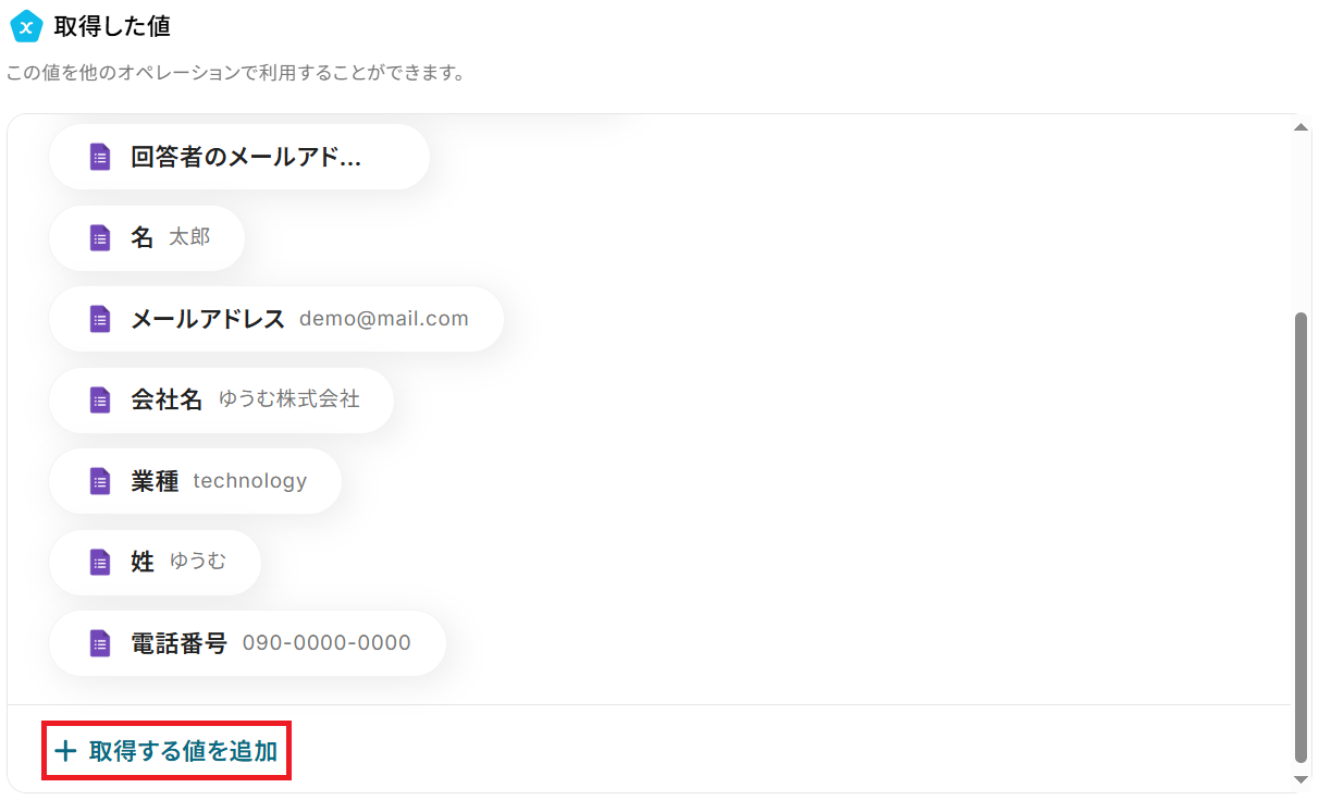 なお、取得した値に取得したいレコードが反映されていないことがあります。その場合「+ 取得する値を追加」から項目を追加できます。