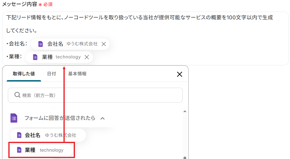 固定の文章やGoogleフォームから取得した値を組み合わせて、自社の対応方法に沿ったプロンプトを作成可能です。