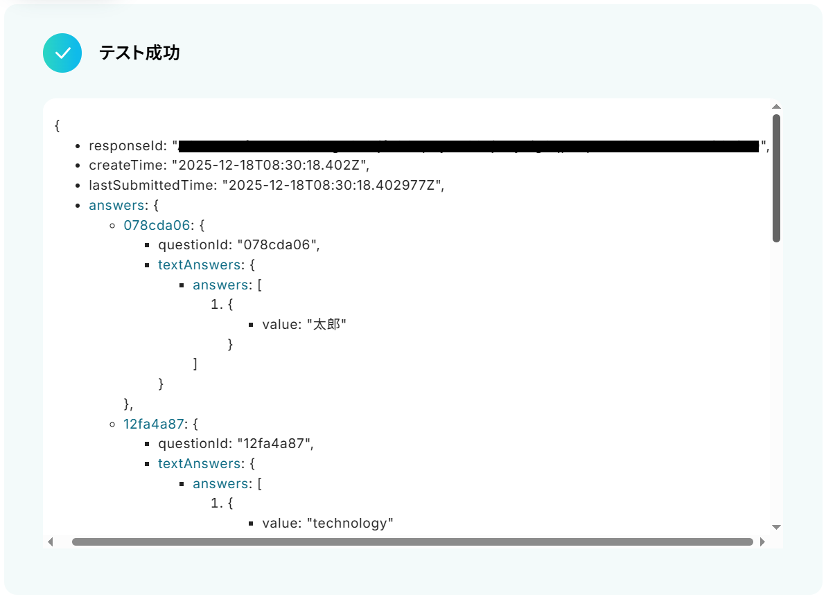 - Googleフォームをトリガーとして使用する際、回答内容の取得方法をご参照ください。