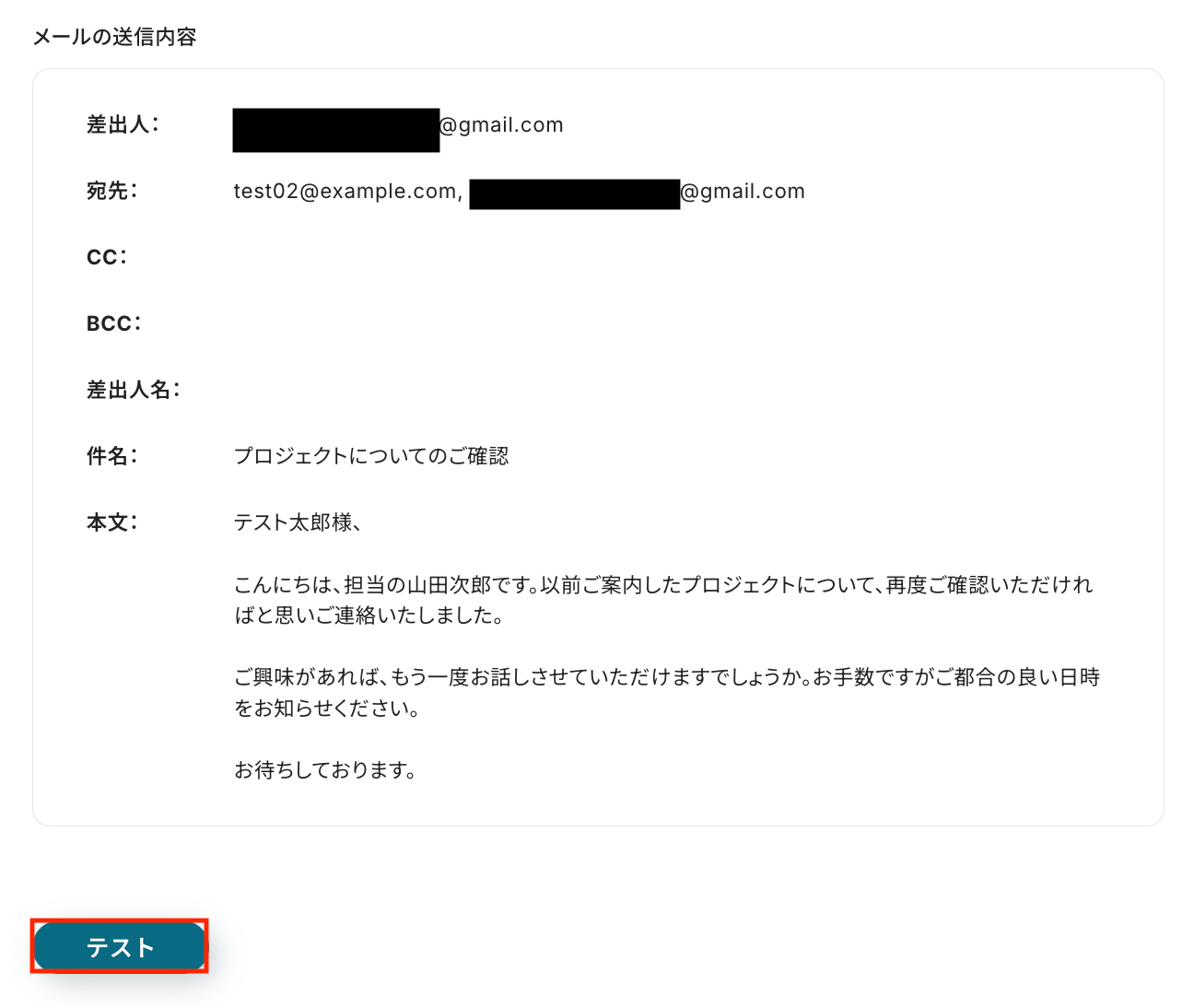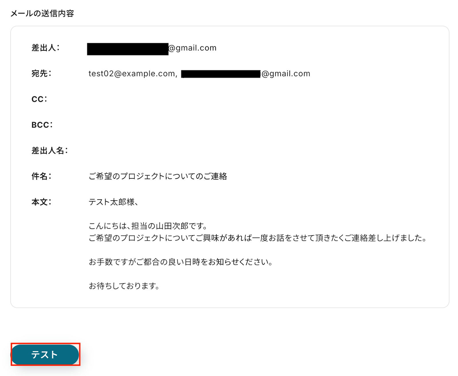 誤送信を避けるため、テスト時はご自身のアドレスやテスト用のアドレスを指定しておくことをおすすめします。