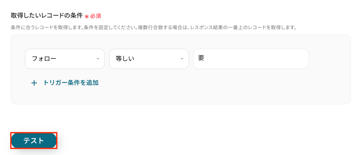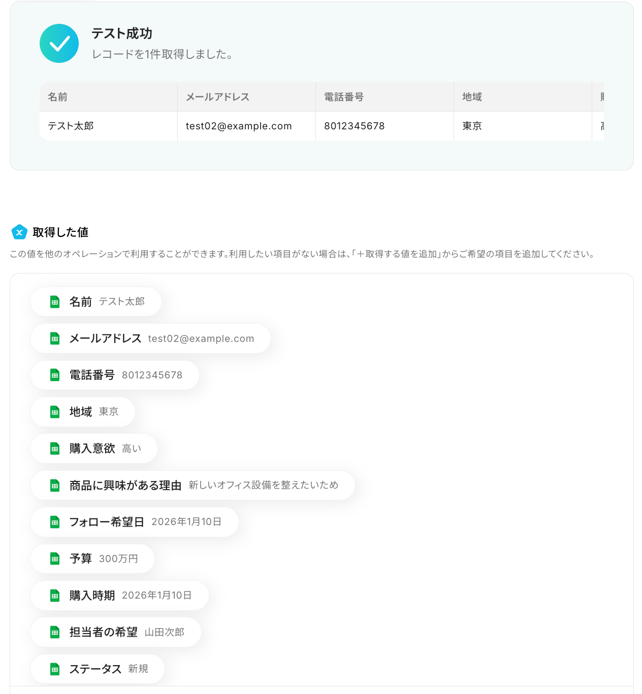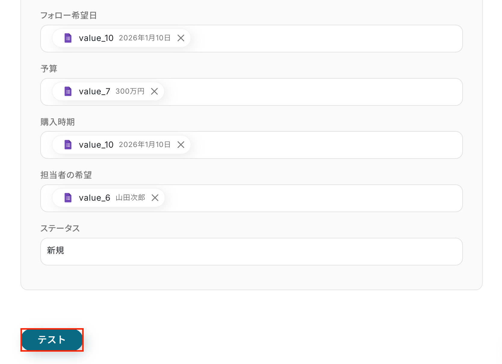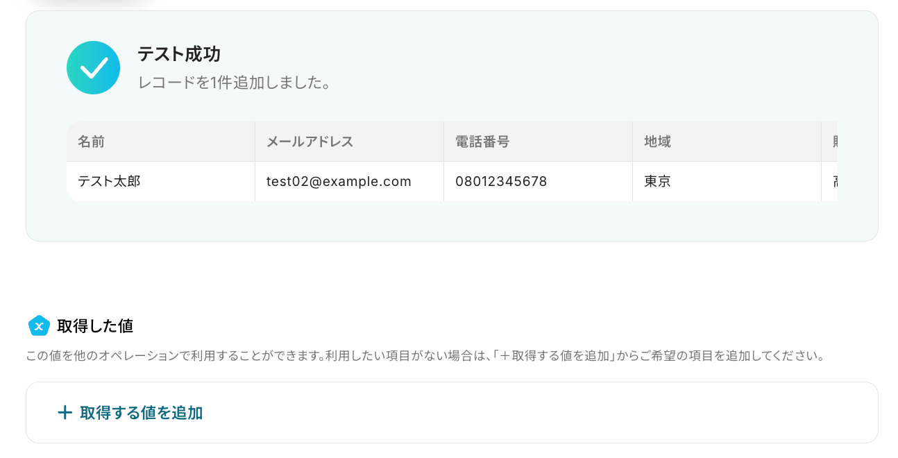 それぞれの項目について入力が完了したら、「テスト」をクリックして、設定した内容でGoogle スプレッドシートにレコードが追加されるか確認しましょう。