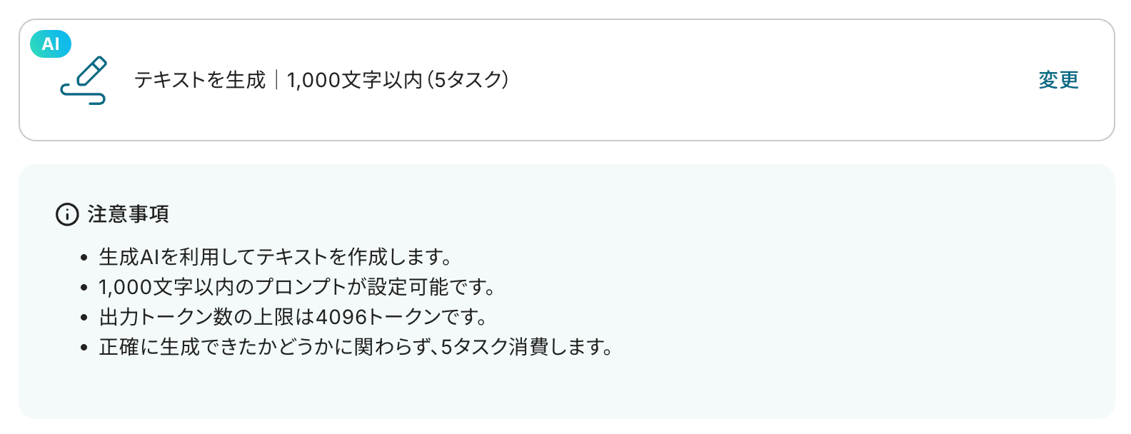 なお、テキストを生成するアクションは、指示可能なプロンプトの文字数によって消費するタスクが異なります。