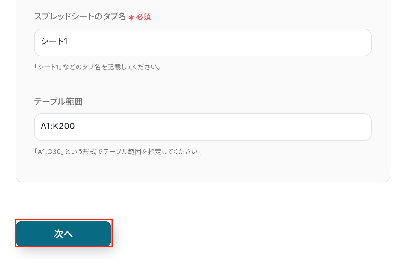 前段で設定したGoogle スプレッドシートのテーブル範囲から、列名(ヘッダー)が自動表示されます。