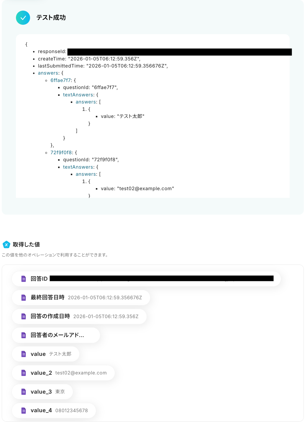 テストに成功すると、Googleフォームに送信された回答(リード情報)が表示されます。 以下の取得した値は、この後のステップで利用できます。なお、YoomのGoogleフォームでは、デフォルトで取得できる値は、「回答ID」「最終回答日時」「回答の作成日時」「回答者のメールアドレス」のみとなっており、ユーザーの回答内容を取得するためには、手動でアウトプットを追加する必要があります。