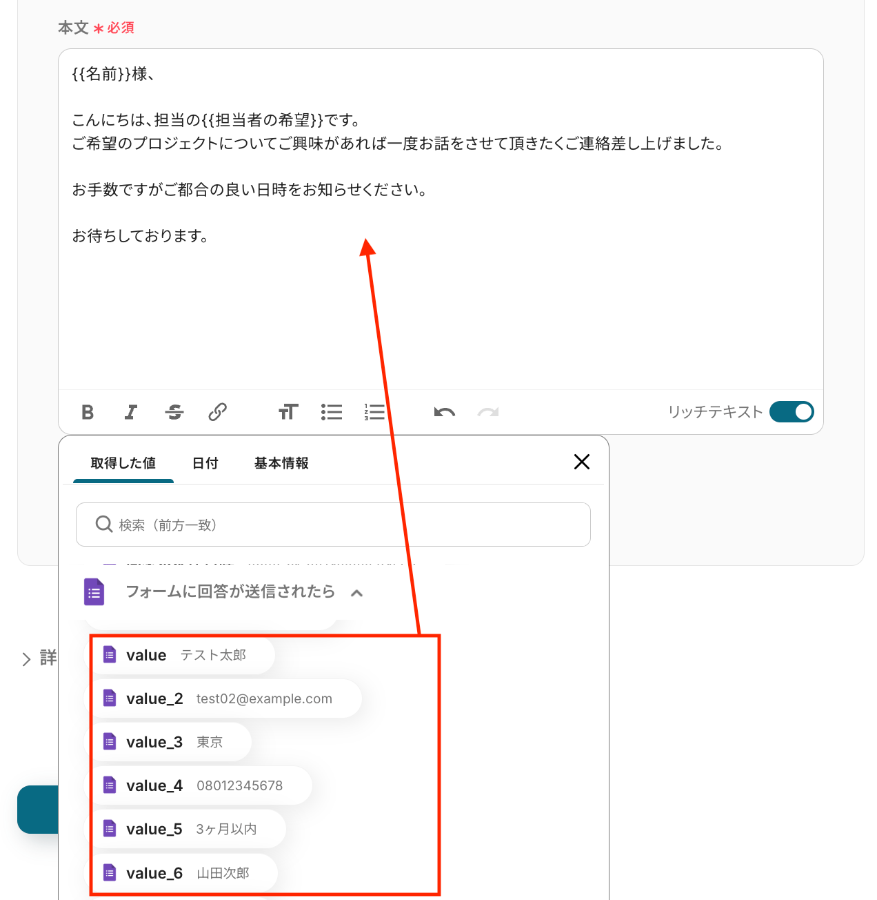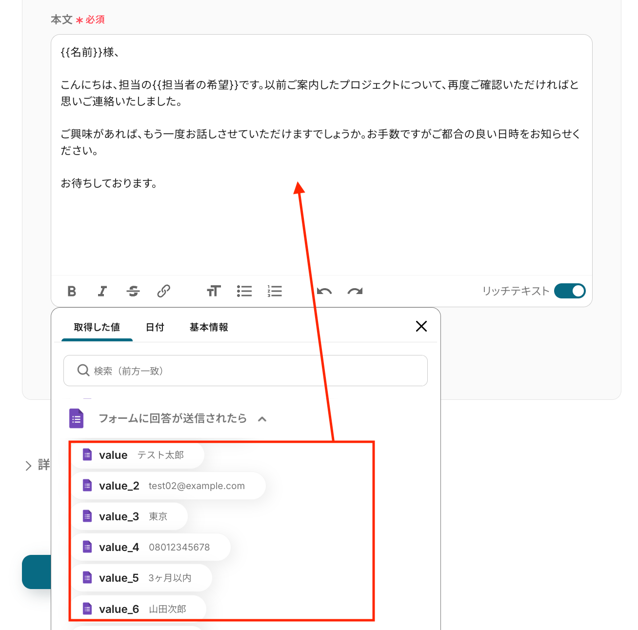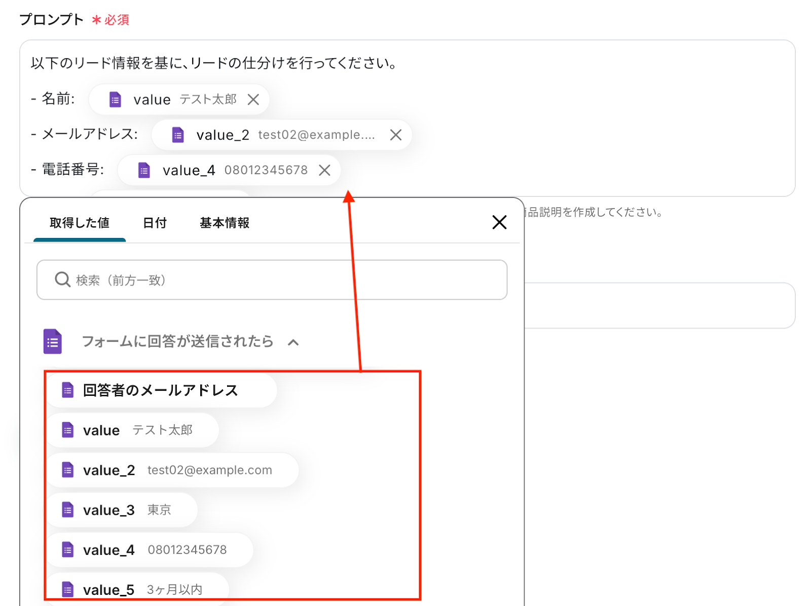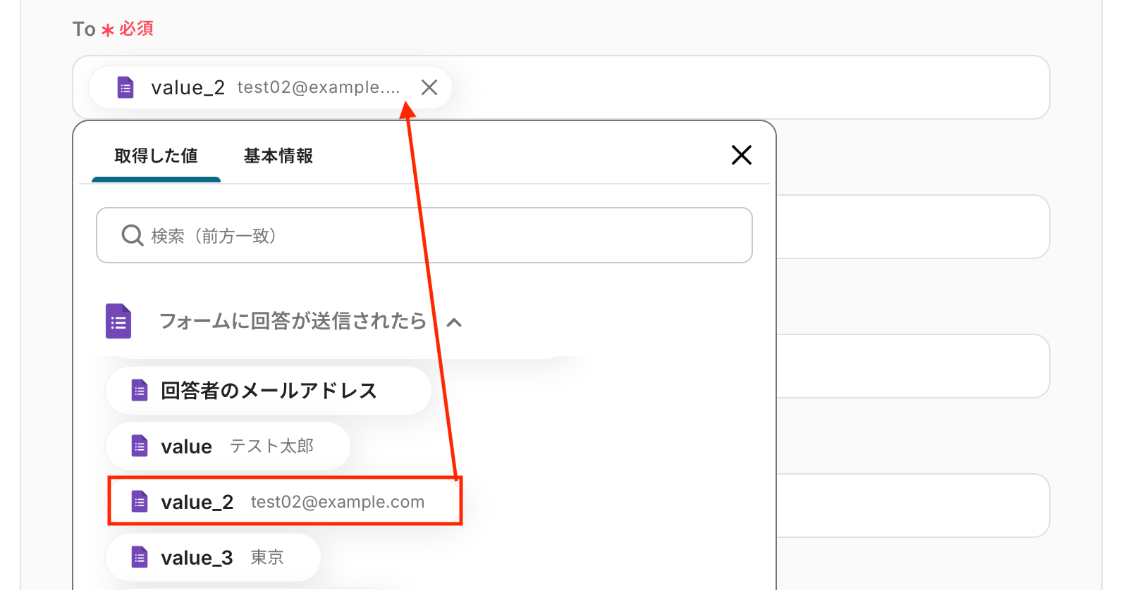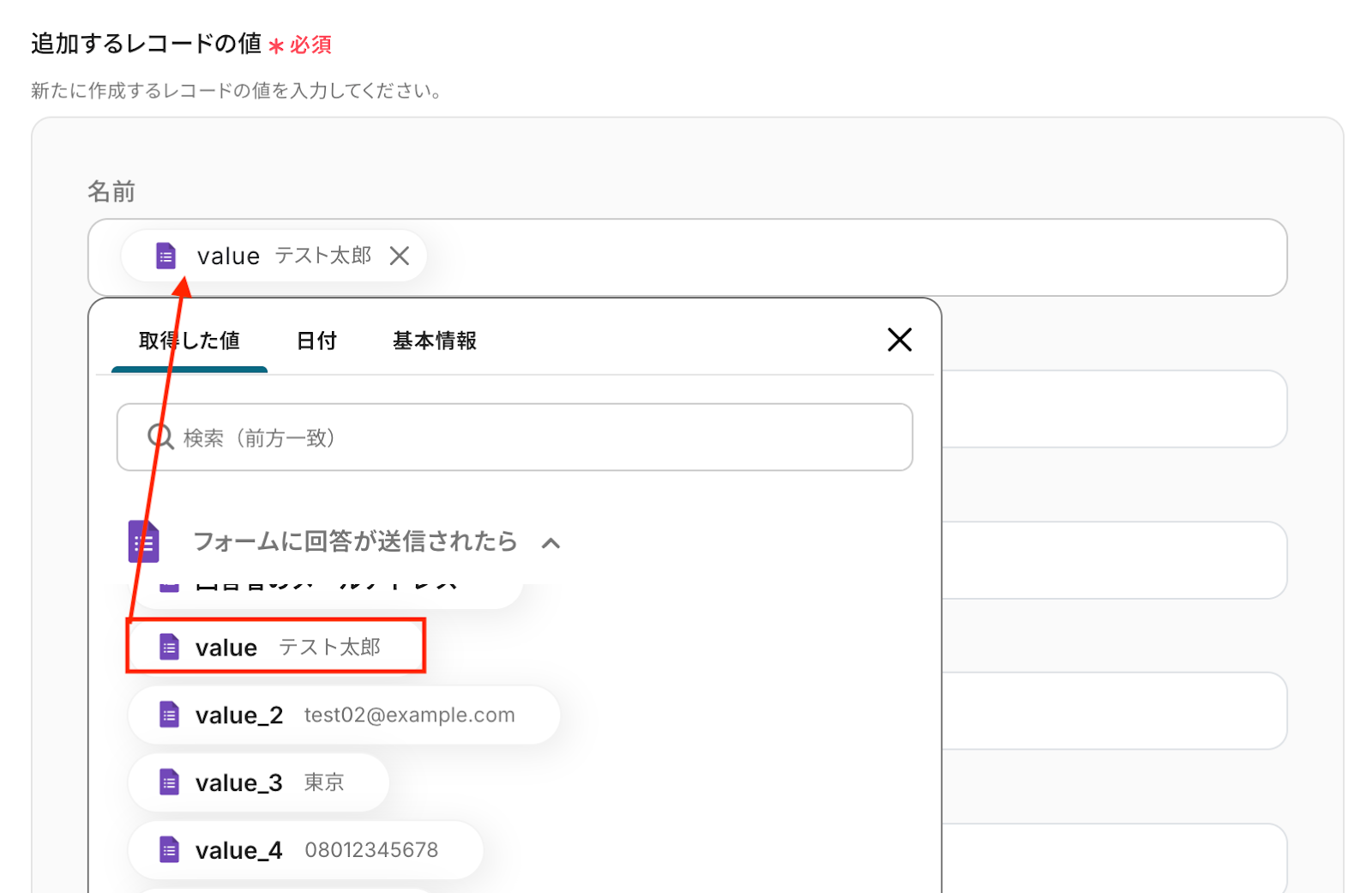 入力欄をクリックすると、前のステップでGoogleフォームから取得した値が表示されるので、選択して入力しましょう。