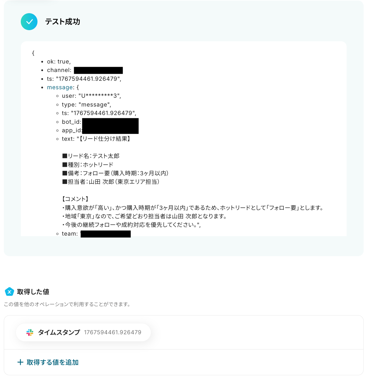 なお、テキストを直接入力した部分は固定値とされるため、取得した値を活用せず設定を行うと毎回同じデータがGoogle スプレッドシートに登録されてしまうので注意が必要です。