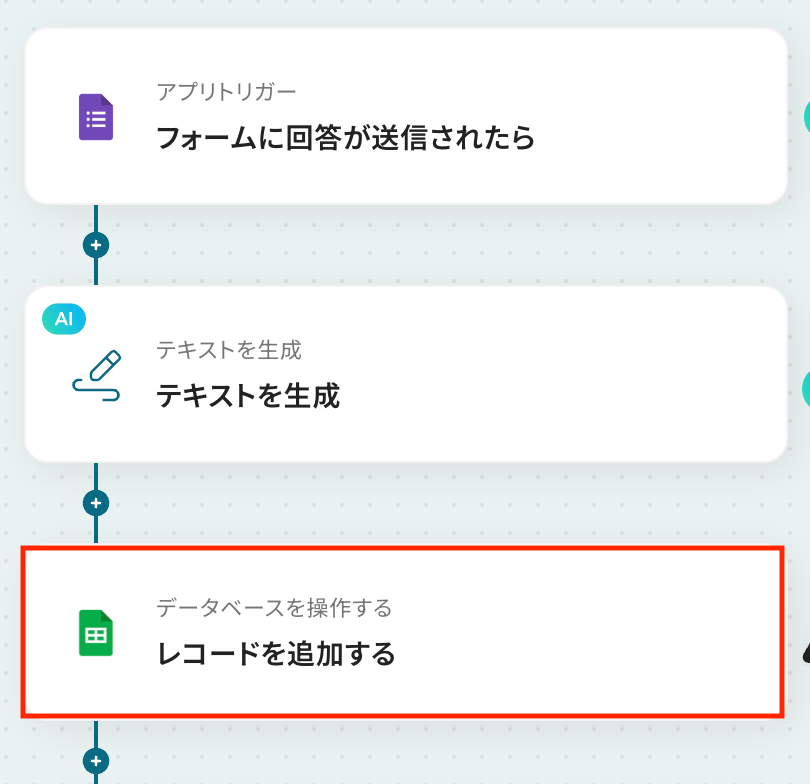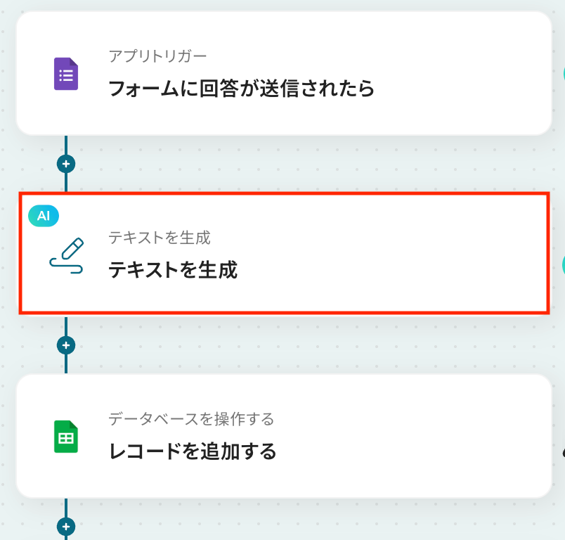 ステップ4:AI機能でテキスト生成 続いて、前のステップでGoogleフォームから取得した回答(リード情報)をもとに、AI機能でテキストを生成しましょう。