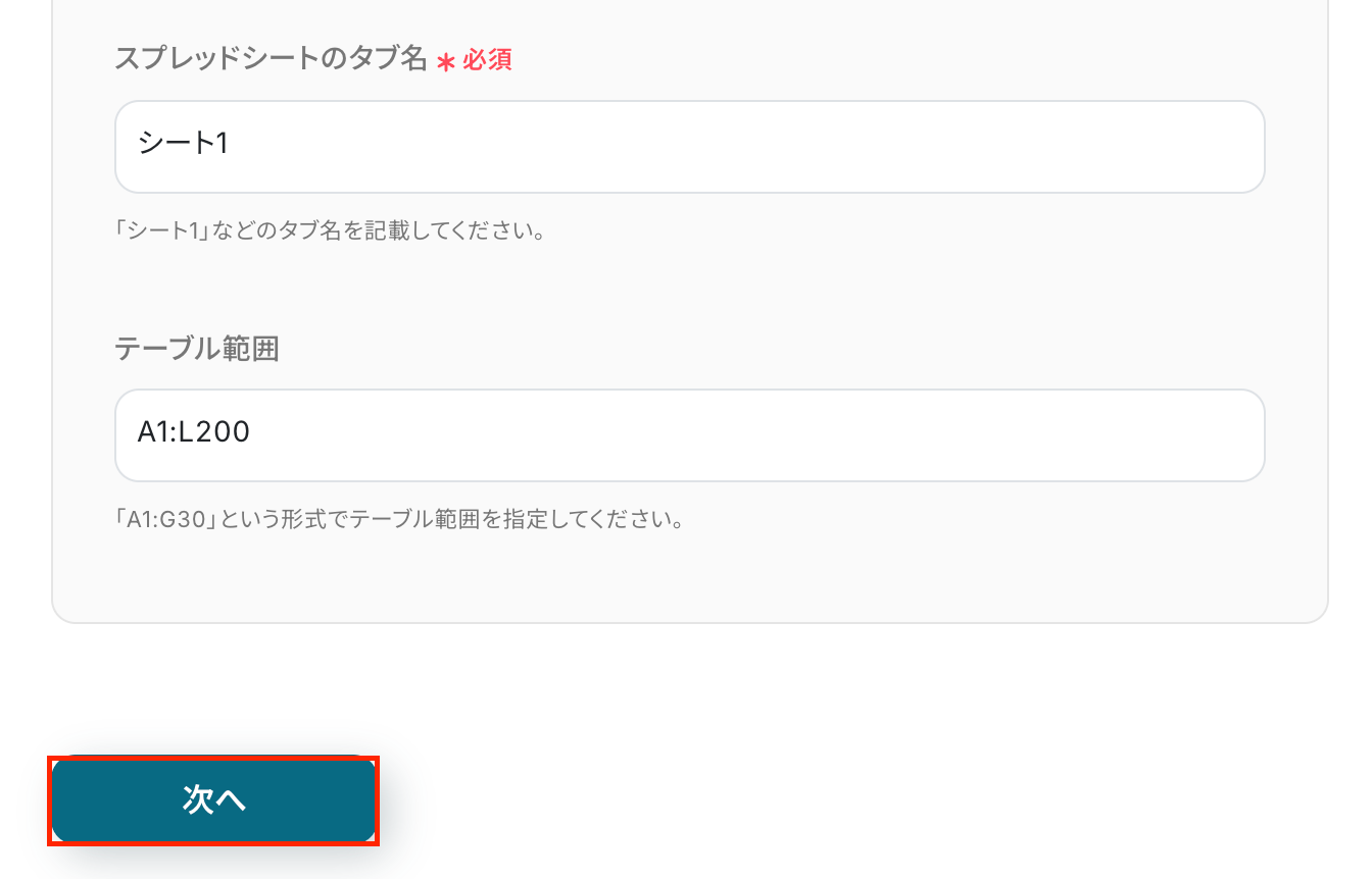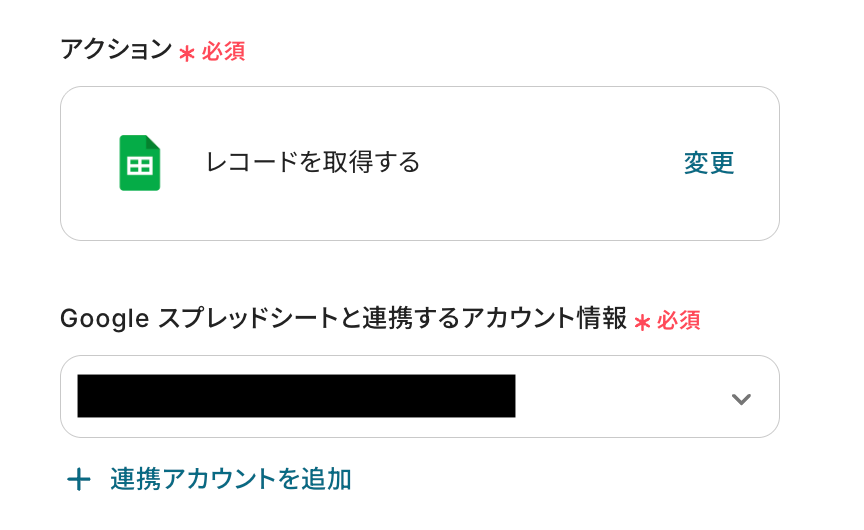 アクションはあらかじめ設定されているため、そのまま内容を確認してください。 Google スプレッドシートと連携するアカウント情報に問題がなければ、「次へ」をクリックします。