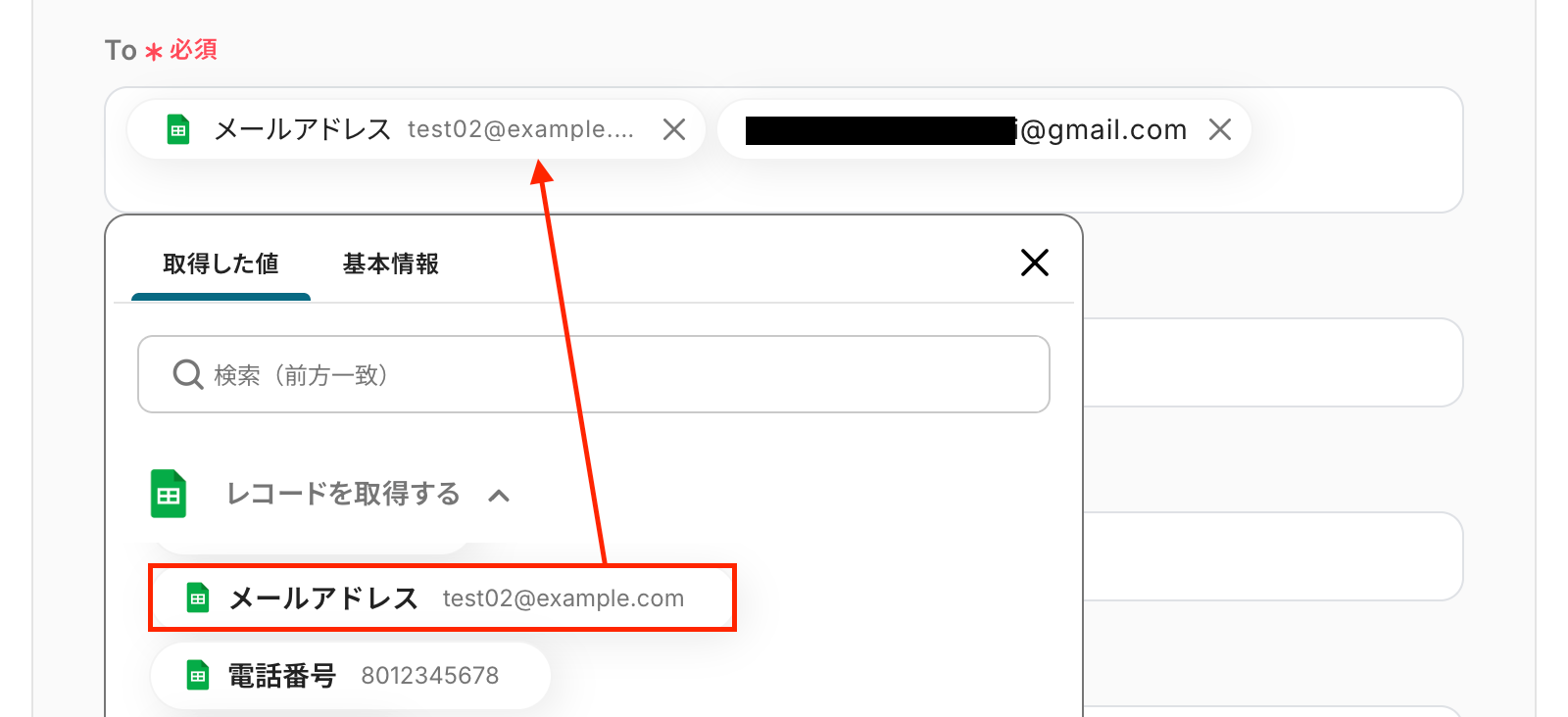 入力欄をクリックすると、前のステップでGoogle スプレッドシートから取得した値が表示されるので選択して入力しましょう。